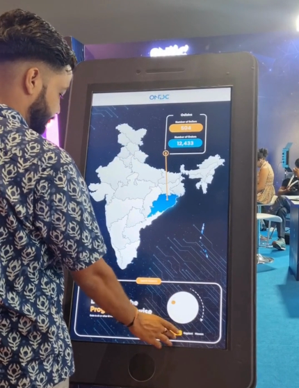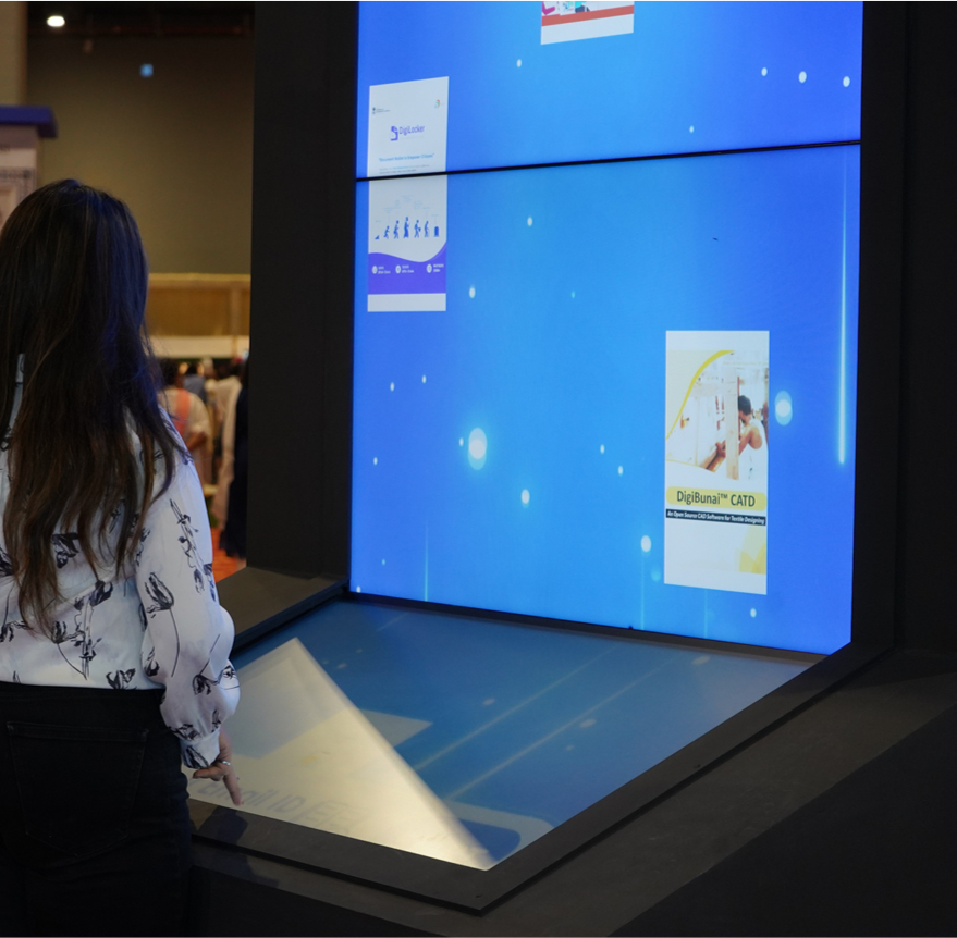 A fusion of digital art and learning, this installation displayed cascading digital brochures on ONDC, UPI, DigiLocker, and Indian heritage. Visitors could explore content and email themselves key insights, symbolizing the spread of digital knowledge.